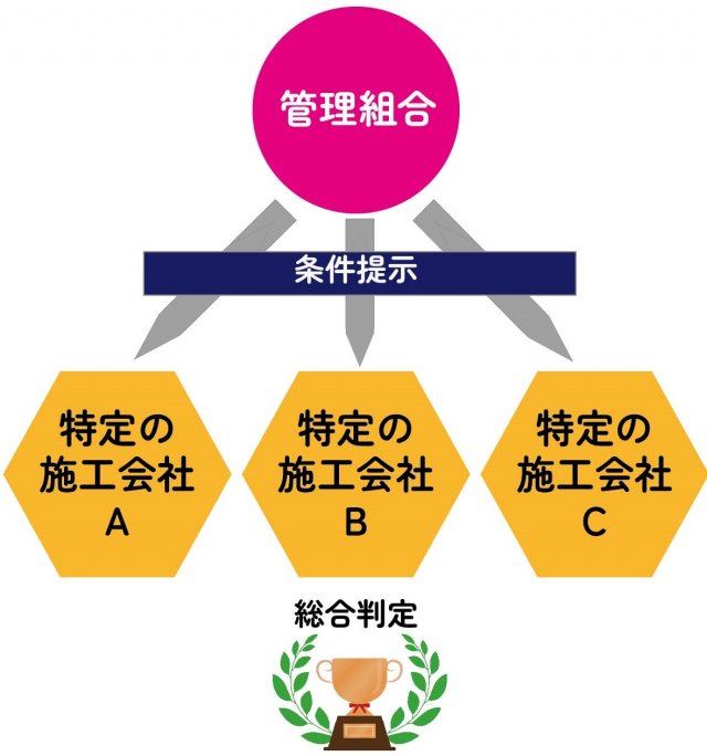 複数の契約希望者に工事内容や入札金額を書いた文書を提出させて内容や金額から業者を決める方式。