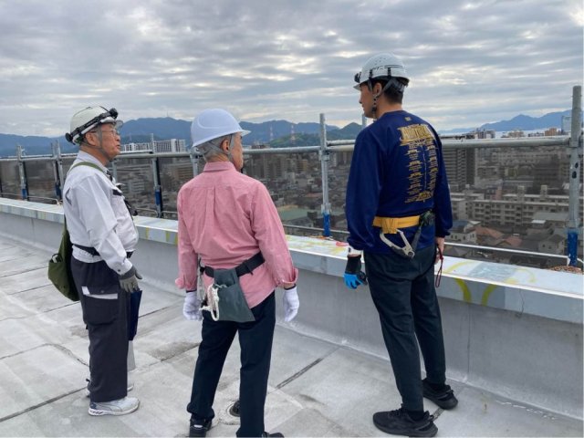 また、このたびマンションの代表者様および工事管理者様とともに外壁補修検査を行い、補修状況や仕上がりを丁寧に確認しました。 現場スタッフとの意見交換を通じて改善点を共有し、より確実で安全な施工体制づくりにも取り組んでいます。 今後も安全・安心な施工を徹底し、居住者の皆さまにご満足いただける修繕工事を目指してまいります。